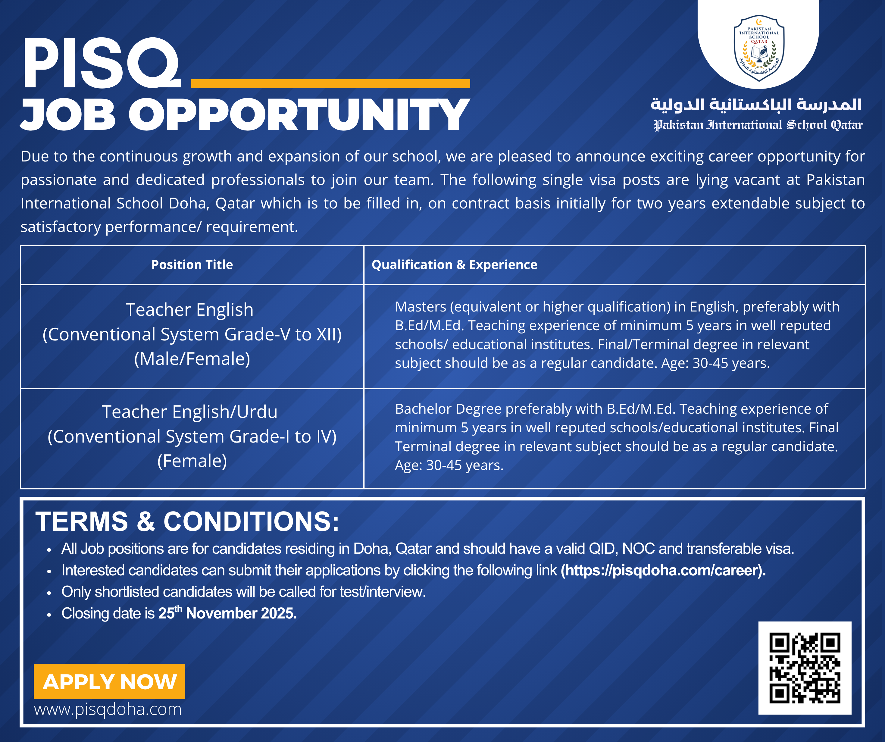 Due to the continuous growth and expansion of our school, we are pleased to announce exciting career opportunity for passionate and dedicated professionals to join our team. The following single visa posts are lying vacant at Pakistan International School Doha, Qatar which is to be filled in, on contract basis initially for two years extendable subject to satisfactory performance/ requirement.