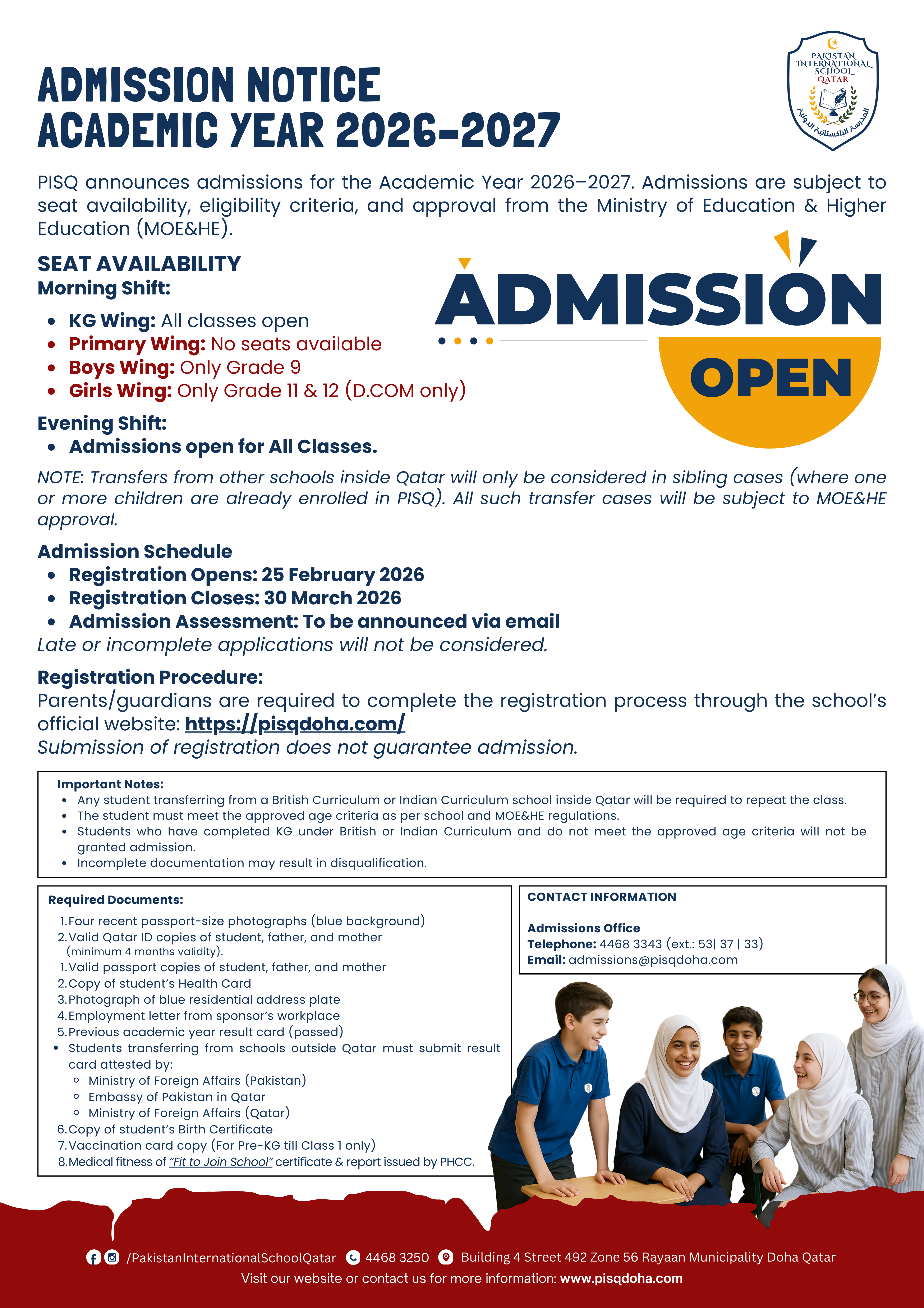 Students must report to the school 10 minutes prior to the Morning Assembly in the proper school uniform, polished shoes, trimmed nails, hair cut (Boys), Head Scarf (Girls) etc.